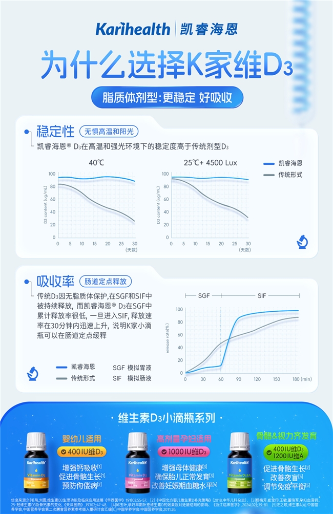 此外,滴剂形式比起传统胶囊形式,杜绝了吞咽困难、明胶卡喉的风险,标准化计量能够精准控制每次的摄入量,既避免了‘无效补D’,又防止了过量摄取的安全隐患。