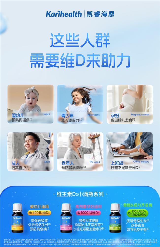 针对全人群差异化补维D需求,凯睿海恩的三款滴剂精准匹配不同人群生理需求:400IU基础款契合婴幼儿每日生理所需,且符合国家婴幼儿喂养指南,温和补充无负担;1000IU高剂量款则针对性地满足生长发育加速期的儿童青少年、老年人皮肤合成维D效率下降及孕产期女性额外的维D营养需求;400IU维D+1200IU维A复配款,直击儿童‘AD同补’核心需求,支持骨骼视力齐发育。